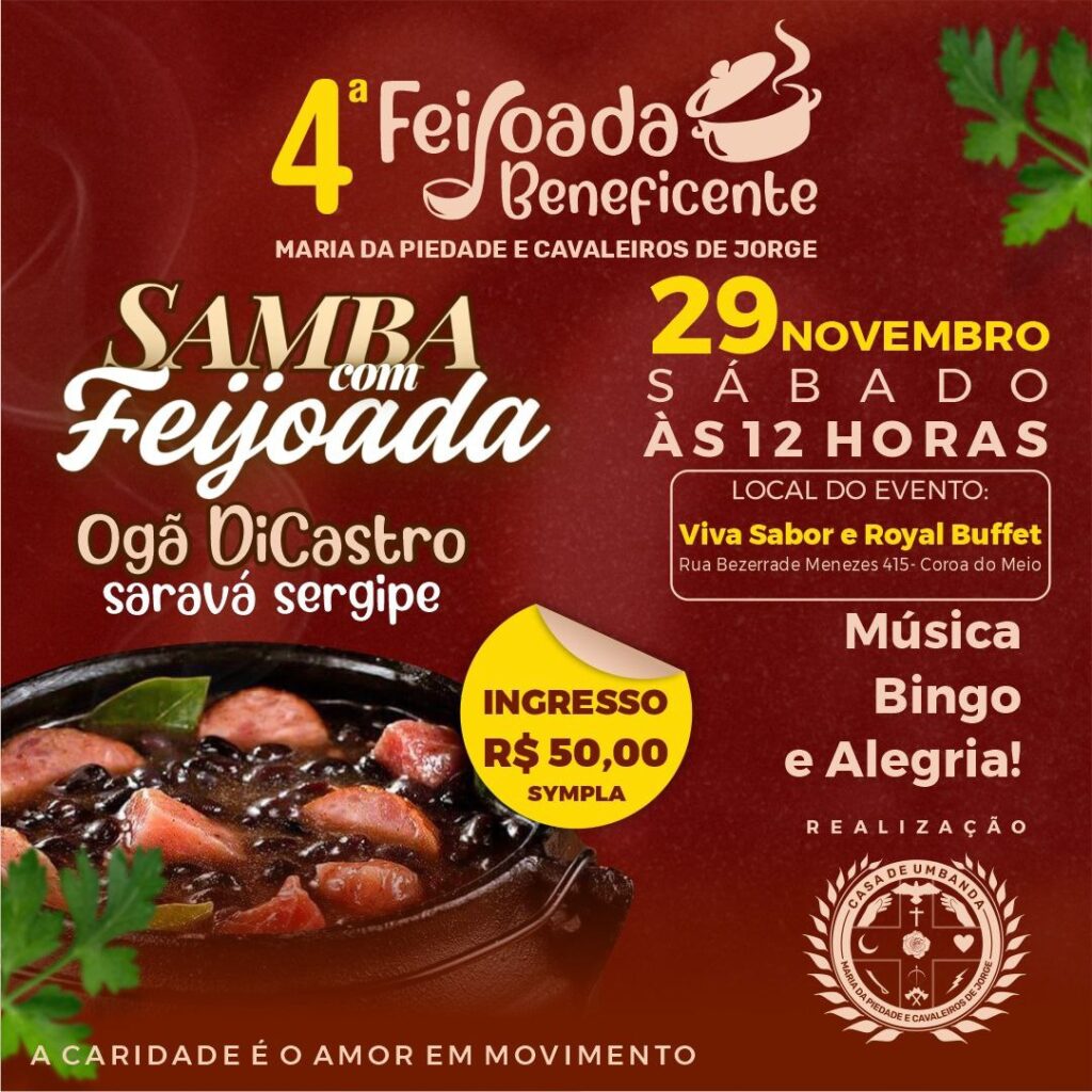 Com o tema “Samba com Feijoada”, a tarde será animada por Ogã DiCastro e Saravá Sergipe, trazendo o melhor da música e das boas vibrações. Além da tradicional feijoada, o público poderá participar de bingo e outras atividades, em um ambiente de harmonia, fé e alegria.