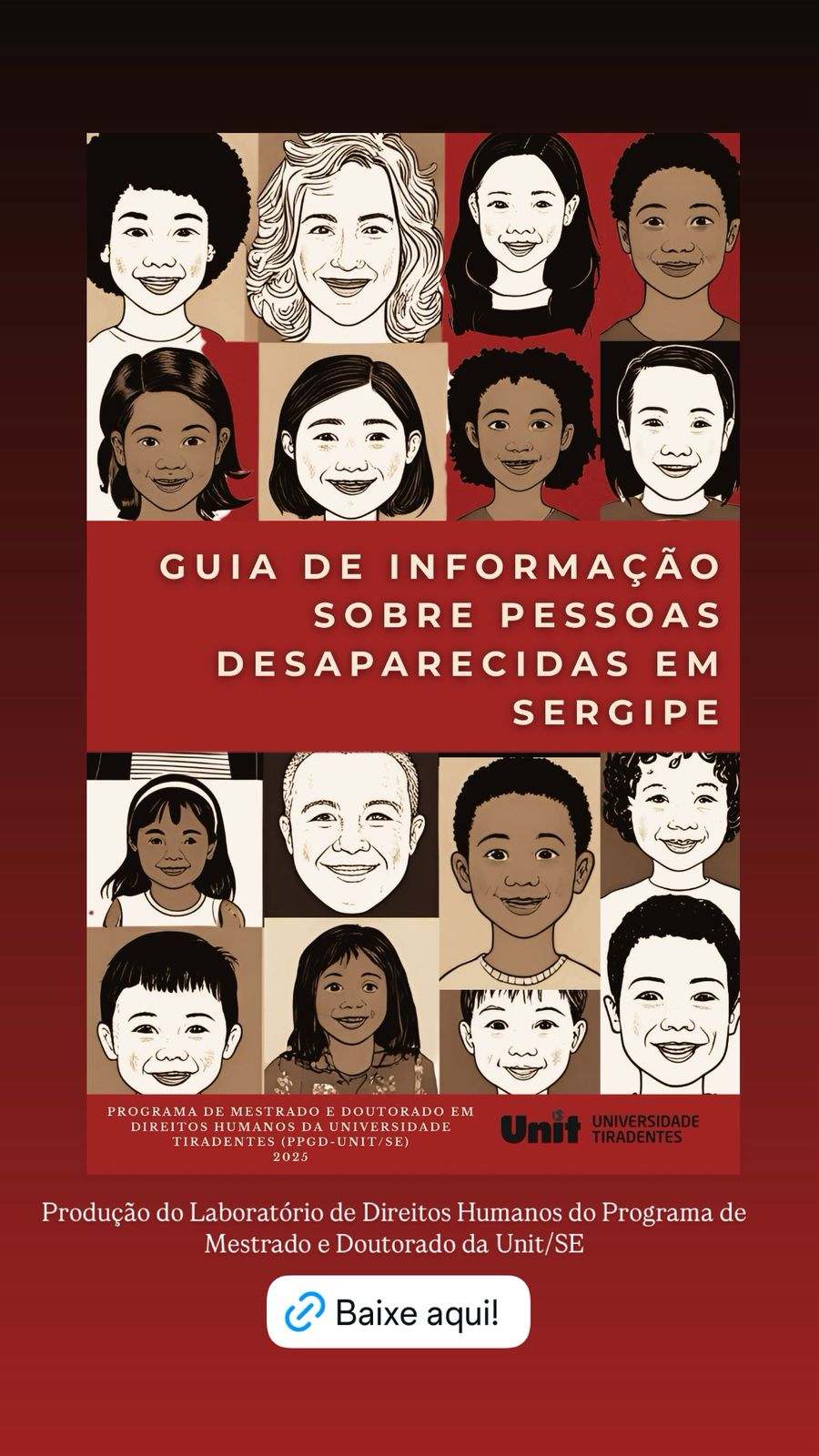 Sensível a essa demanda social e em consonância com a Política Nacional de Busca de Pessoas Desaparecidas (Lei 13.812/2019), o Programa de Pós-Graduação em Direitos Humanos da Universidade Tiradentes (PPGD-Unit) desenvolveu e lançou a cartilha “Guia de Informação sobre Pessoas Desaparecidas em Sergipe”. O material, resultado de um esforço colaborativo, foi criado para funcionar como um instrumento de apoio e orientação à população sergipana, trazendo dados claros e confiáveis para familiares, agentes da segurança, profissionais da assistência social e do setor jurídico.