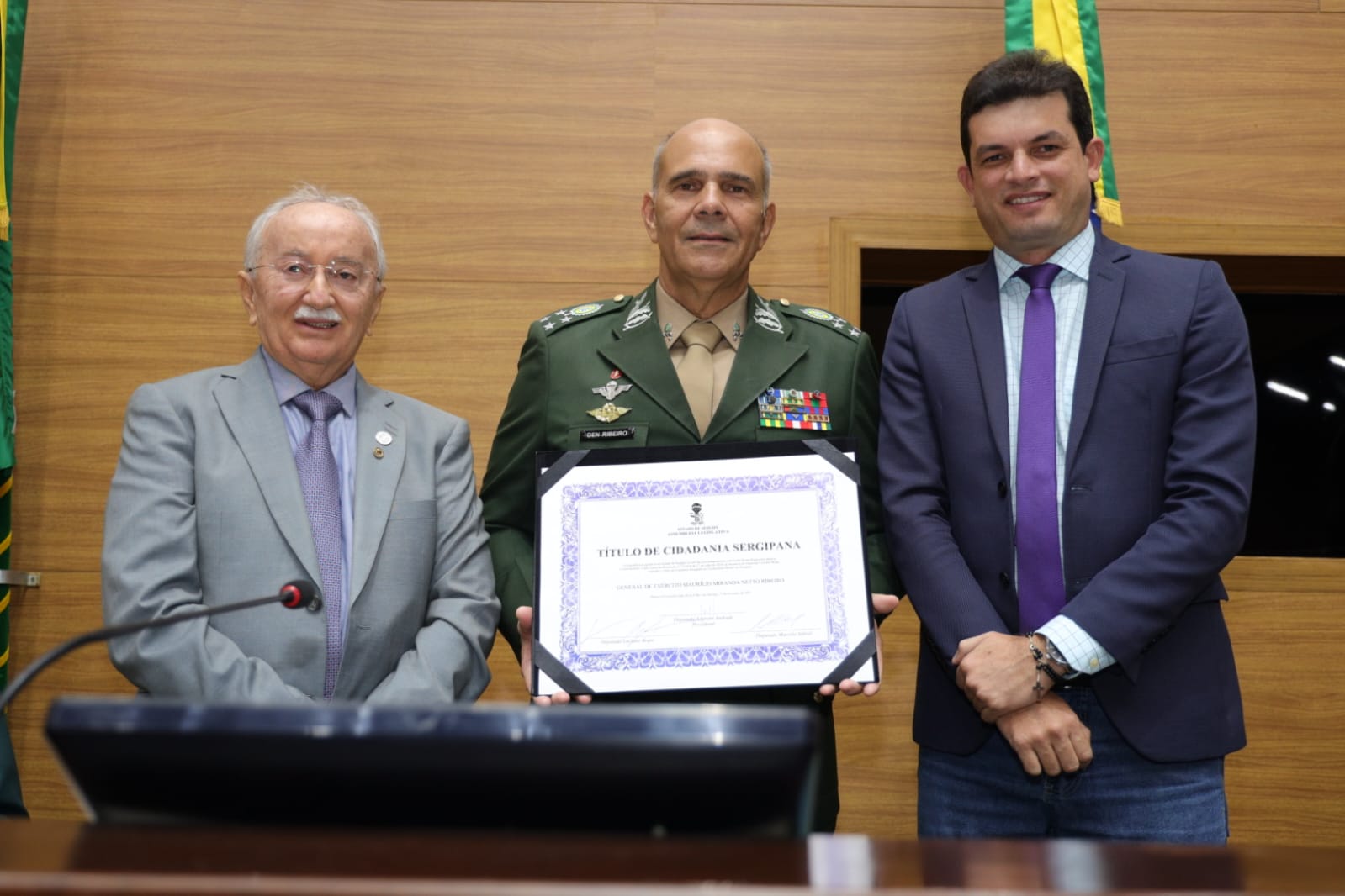 Para ele, receber o Título de Cidadão Sergipano é motivo de honra e gratidão. “Estamos muito felizes e muito honrados com essa enorme distinção concedida pela Assembleia Legislativa de Sergipe com a iniciativa do deputado Luciano Bispo; que soa para nós como uma homenagem ao Exército Brasileiro, instituição formada por homens e mulheres que dia após dia,atuam se preparando para atender a toda e qualquer demanda da nação brasileira, em estado de disponibilidade permanente, prontos para atender a qualquer chamado da sociedade em todas as áreas que precisar. Nós estamos muito satisfeitos com essa homenagem; um belíssimo gesto de nobreza institucional da parte da Alese, na medida que reconhece o valor dessa instituição, que não pertence aos aos homens fardados de verde oliva, mas um patrimônio da nação brasileira. Agradeço à Assembleia Legislativa de Sergipe por ter conferido a mim esse Título de Cidadão Sergipano, que haverei de carregar com muita honra e direi que sou sergipano, além que carioca”, ressalta destacando o gesto de nobreza institucional por parte da Assembleia Legislativa.