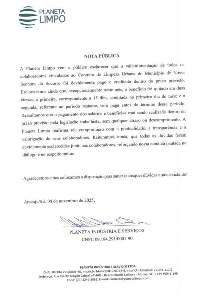 A Planeta Limpo vem a público esclarecer que o vale-alimentação de todos os colaboradores vinculados ao Contrato de Limpeza Urbana do Município de Nossa Senhora do Socorro foi devidamente pago e creditado dentro do prazo previsto.