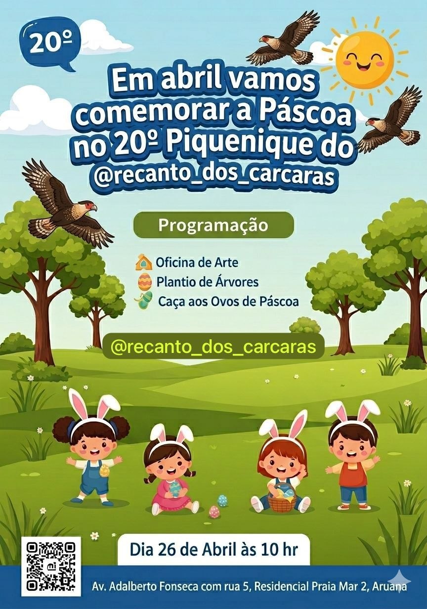 O 20º Piquenique de Páscoa será realizado no dia 26 de abril, a partir das 10h, no Recanto dos Carcarás, localizado na Avenida Adalberto Fonseca com a Rua 5, no Residencial Praia Mar 2, em Aruana. Voltado para famílias e crianças, o evento contará com atividades como oficina de arte, plantio de árvores e caça aos ovos de Páscoa.