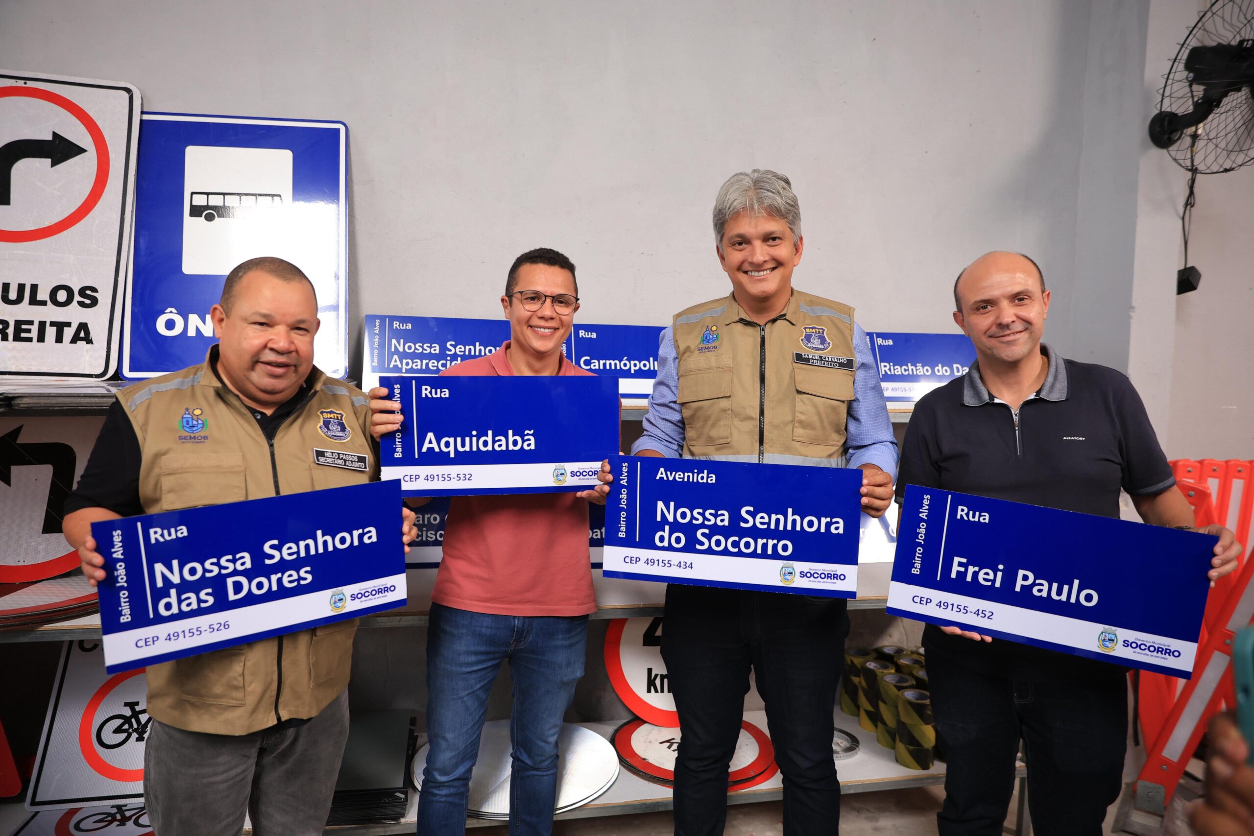 A Avenida São Cristóvão, no João Alves, foi a primeira a ser sinalizada, em um ato simbólico. “É a primeira vez na história do município de Socorro que o poder público vai sinalizar todas as ruas com CEP e com endereço, algo que nunca aconteceu desde a criação dos conjuntos habitacionais. Geralmente a população colocava a sinalização nos muros, de lápis, de caneta ou de tinta, então isso carrega um simbolismo gigantesco para a nossa cidade, a gente vai identificar todos os bairros e todas as ruas com CEP, facilitando para o motorista de aplicativo, facilitando a vida dos Correios e da comunidade em geral, melhorando a mobilidade urbana”, afirmou Alan Mota.